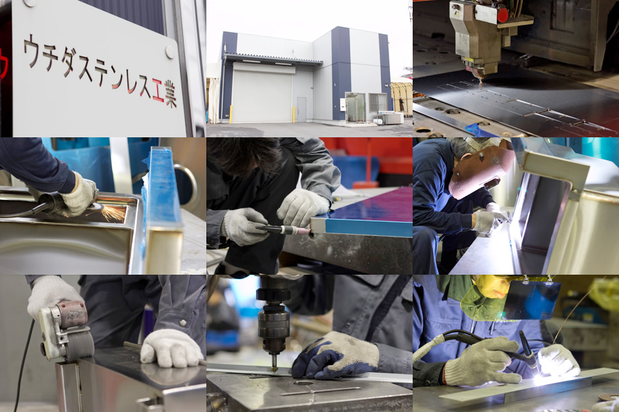 金属加工のことならウチダステンレスさんにご相談ください! ステンレス・スチール・アルミなど様々な部材における 什器・厨房機器をはじめ、装飾金物・サイン・機械パーツ など、制作からレーザー加工・曲げ・溶接・組立加工まで 金属加工を一括して行っております。